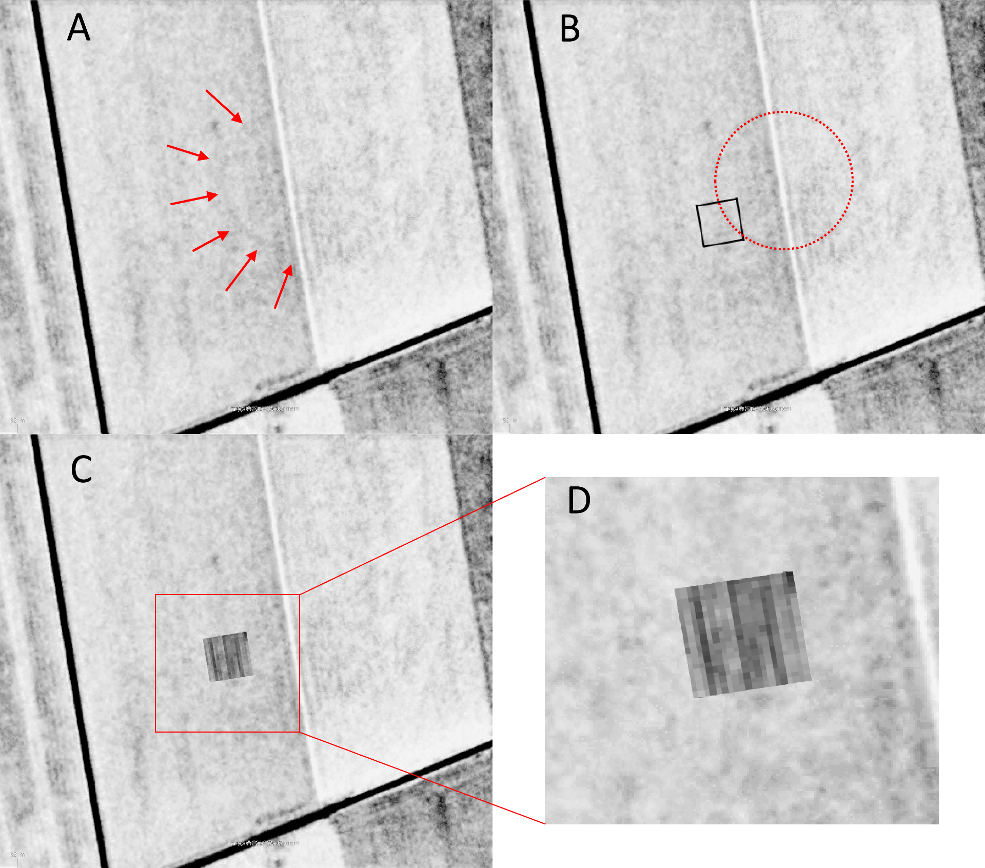 Das im Google Earth Luftbild schwach erkennbare Kreissegment (Bild A, rote Pfeile) deutet auf die mögliche kreisförmige Anomalie eines Kreisgrabens hin (Bild B, rote Punktlinie).