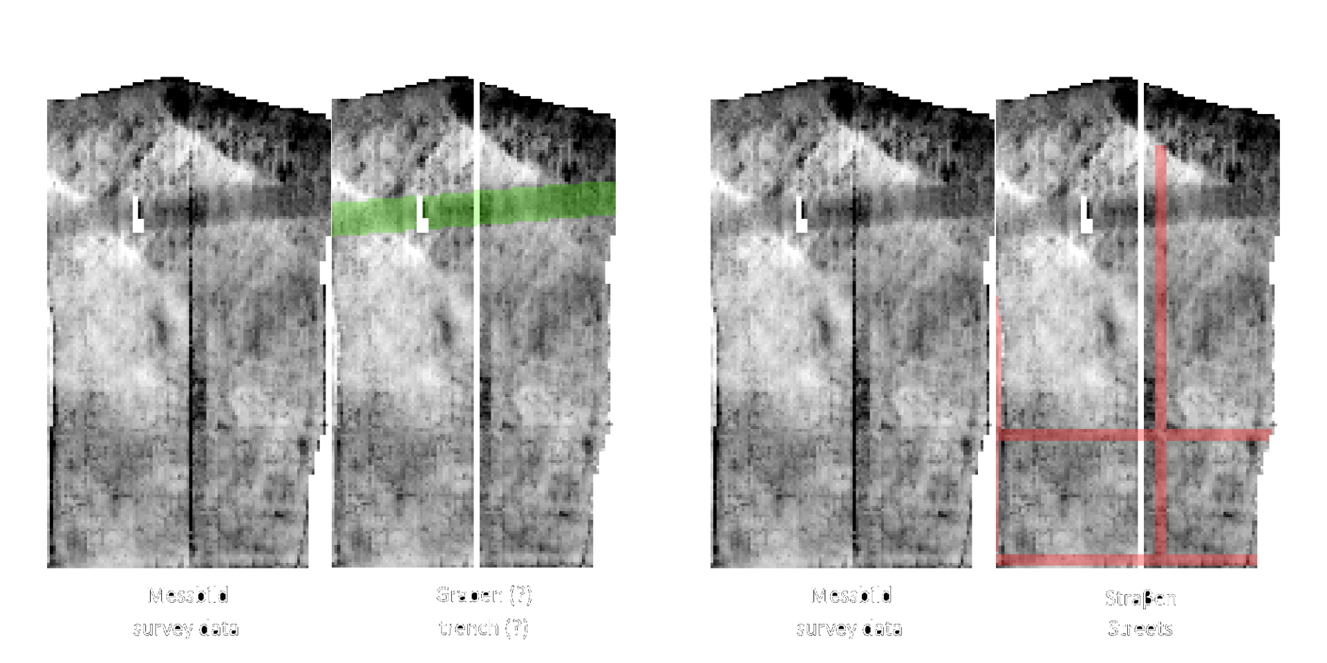 The presumed ditch structure, which is approx. 12 m wide and runs across the entire survey area, is highly resistive and thus raises questions about its backfilling, which should generally consist of the material on the sides, but should then be perceived as low resistance. However, a strong compaction or backfilling with stone material is unlikely to explain the measured values.